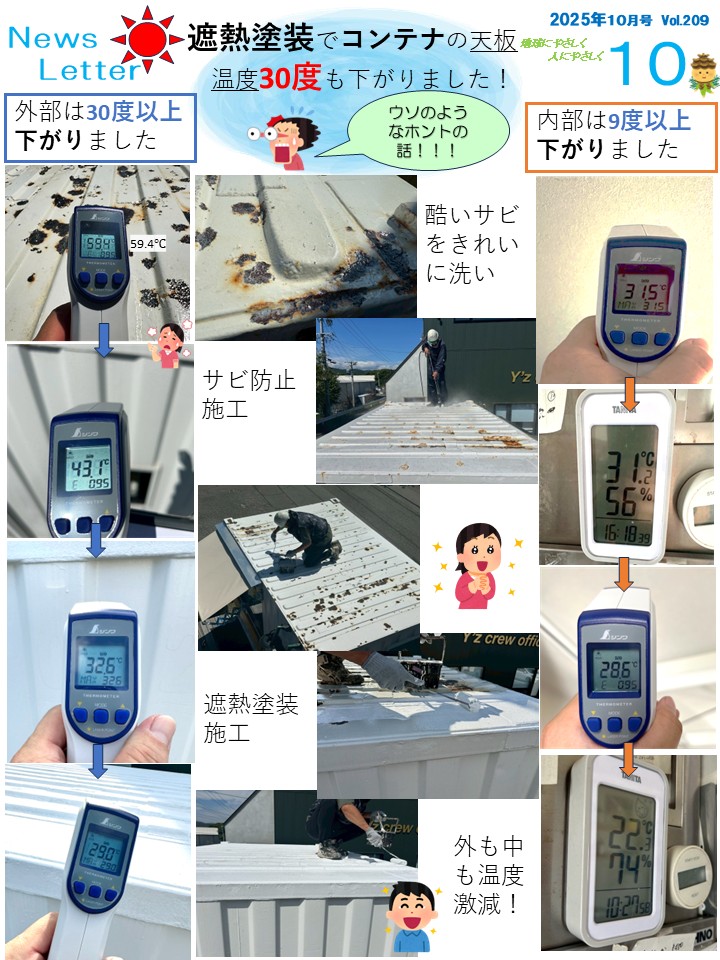 先月にてコンテナの屋根に弊社サービスの「遮熱塗装」を施工いたしました。すると、天板温度が塗装前59.4℃だったところ、塗装後には29.0℃になり、なんと30℃も表面温度の低下を実現いたしました。それに伴い室内は9℃以上も下がり、大幅に涼しくなっております。