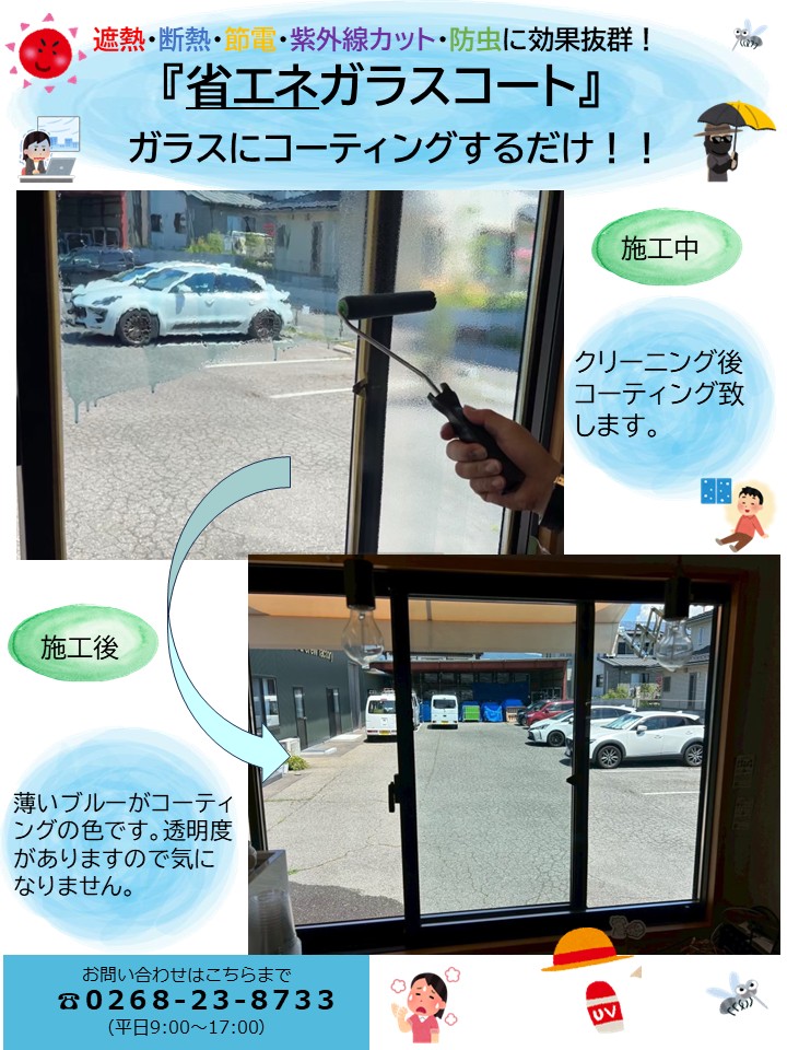 加えて、「省エネガラスコート」をガラスに塗るだけで、外からの夏の西日やじりじり暑さを大幅カットすることができ、室内を更に涼しく保つことが期待できます。また、どちらのサービスもエアコンの空調負荷を軽減でき、電気代を抑えることができますので省エネです。