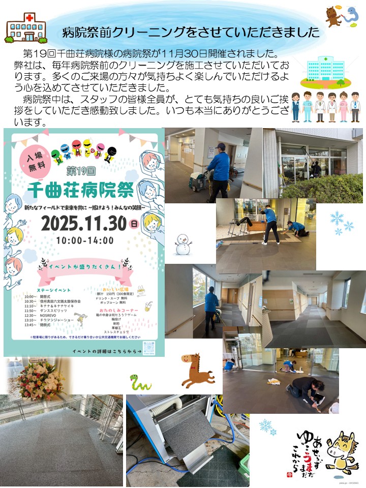 さて今月号ですが、病院祭前クリーニングをさせていただきました。第19回千曲荘病院様の病院祭が11月30日開催され、弊社は毎年病院祭前のクリーニングを施工させていただいております。多くのご来場の方々が気持ちよく楽しんでいただけるよう心を込めてさせていただきました。